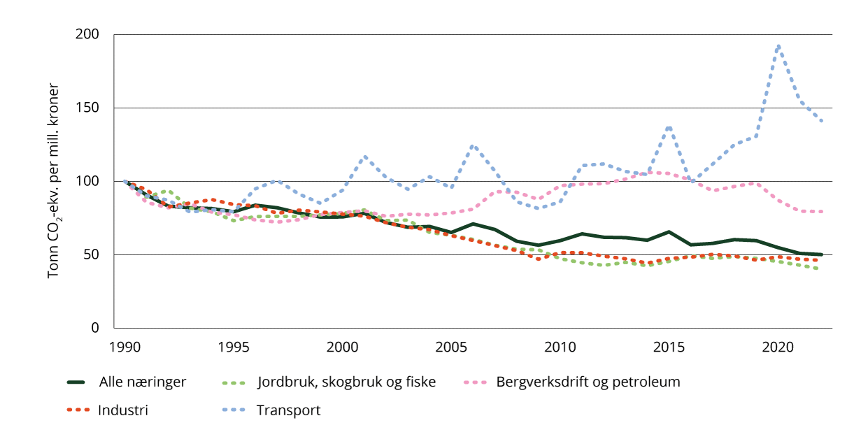 Indikator 1b viser samlet utslippsintensitet for Norge og for de fire sektorene med høyest intensitet. Som følge av manglende datagrunnlag har det ikke vært mulig å oppdatere denne indikatoren i år. Av figuren ser vi at utslippsintensiteten i Norge har blitt redusert med 48 prosent i løpet av de siste 30 årene. Reduksjonen har hovedsakelig skjedd i løpet av de første 20 årene (1990–2010), mens utviklingen siden har stagnert. Det er likevel stor forskjell på utviklingen i de enkelte sektorene. I industrien er utslippsintensiteten halvert siden 1990, mens den har økt i transportsektoren.38 Nærmere omtale av utviklingen i de enkelte sektorene er gitt i sektorkapitlene i kapittel 3.