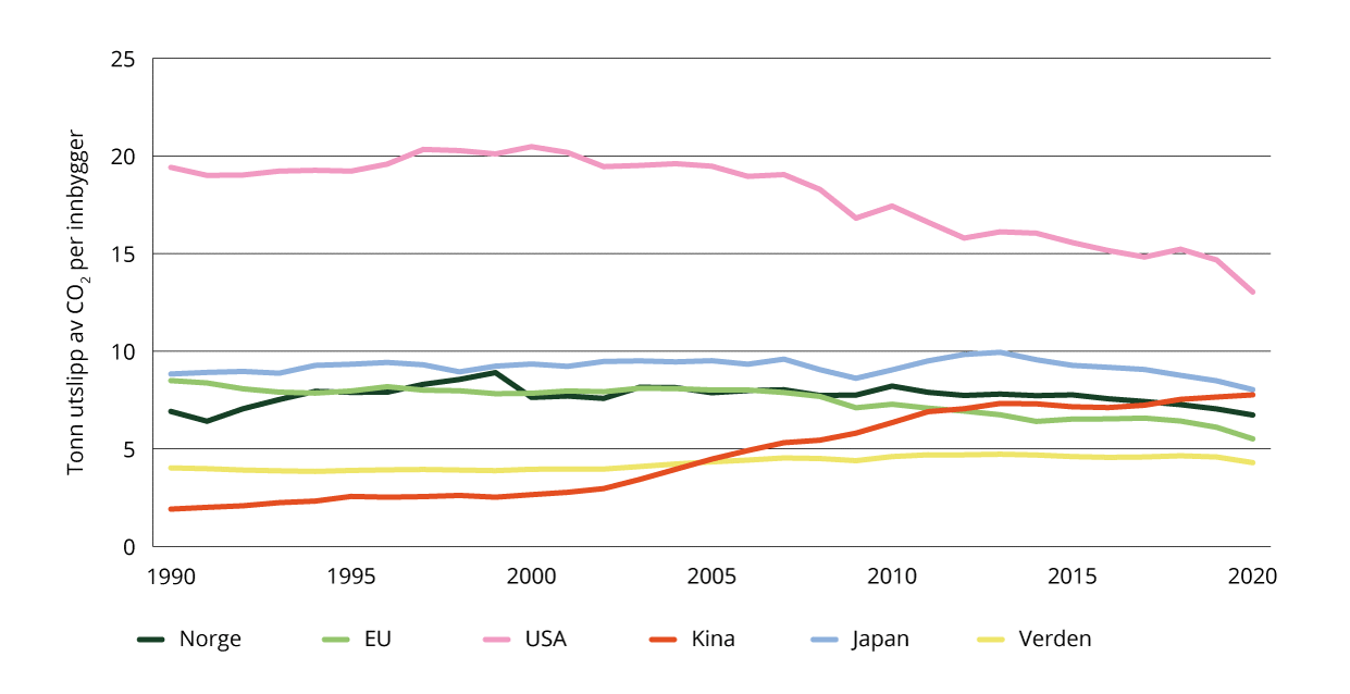 Denne indikatoren viser hvordan utslippene av CO2 har utviklet seg over tid sammenlignet med utslippene i andre land, når man tar hensyn til folketallet. Som følge av manglende datagrunnlag har det ikke vært mulig å oppdatere denne indikatoren i år. I 2020 ligger Norges utslipp av CO2 per innbygger høyere enn snittet for EU og verden, og litt lavere enn snittet for folkerike land som Kina og Japan. Fra 2010 til 2020 har Norge hatt en svak reduksjon i utslippene av CO2 per innbygger, og samtidig har folketallet økt med rundt 11 prosent.