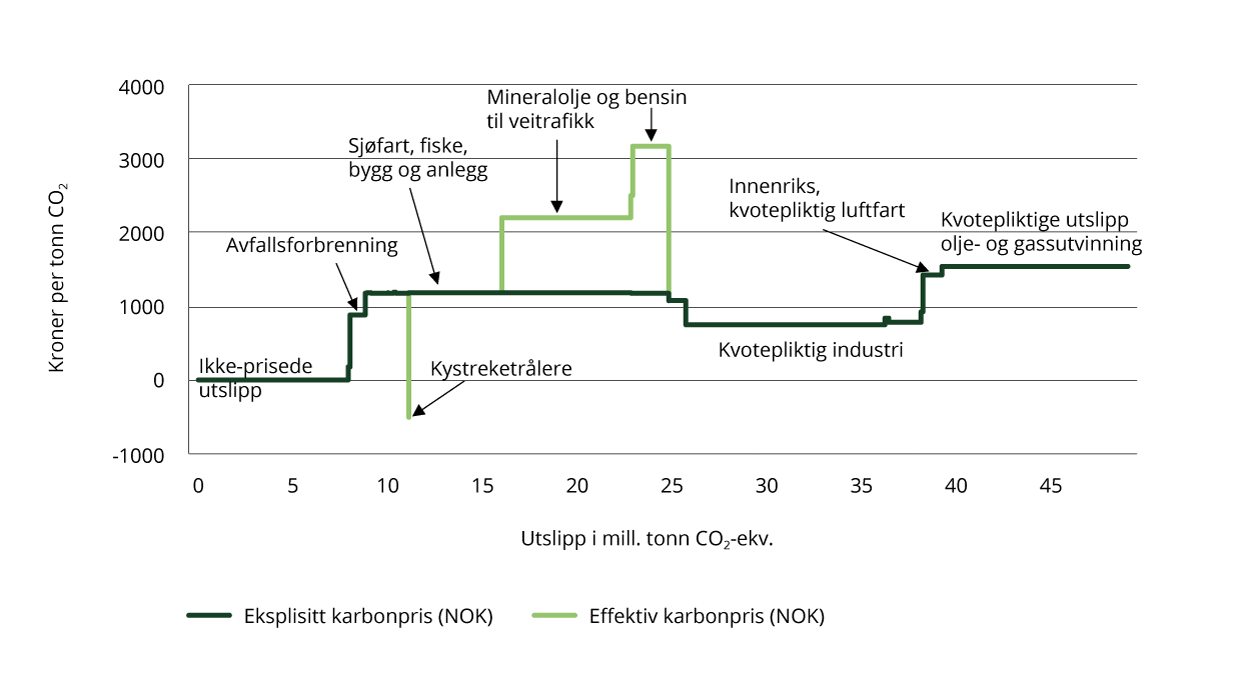 Indikatoren viser prisene på utslipp av klimagasser i ulike sektorer i Norge. Eksplisitte karbonpriser inkluderer alle priser som er satt for å regulere utslipp, vanligvis gjennom avgifter eller kvotesystemer. Noen sektorer er underlagt både kvoteplikt og avgift. Effektive karbonpriser inkluderer all prising uavhengig av formål, og det innebærer at prising som ikke direkte er ment å regulere utslipp av klimagasser, også er inkludert. Indikatoren viser for eksempel at kvotepliktig utslipp i olje- og gassnæringen har en eksplisitt karbonpris på 1 539 kroner og et samlet utslipp på 9,8 millioner tonn. Kystreketrålerne betaler CO2-avgift på drivstoff, men mottar samtidig et tilskudd basert på hvor mye drivstoff de forbruker, gjennom Garantikassen for fiskere. Tilskuddet er vesentlig høyere enn avgiften per liter drivstoff, noe som resulterer i en samlet netto effektiv karbonpris på -500 kroner per tonn CO2. For mineralolje og bensin til veitrafikk skyldes forskjellen mellom netto effektive og eksplisitte priser veibruksavgiften. Det er den netto effektive karbonprisen som bestemmer prisen på aktiviteter som gir utslipp av klimagasser, for eksempel gjennom pumpeprisen. Mål på netto effektive karbonpriser er derfor viktige for å forstå hvordan endringer i skatter, avgifter og tilskudd samlet kan påvirke utslipp av klimagasser.
