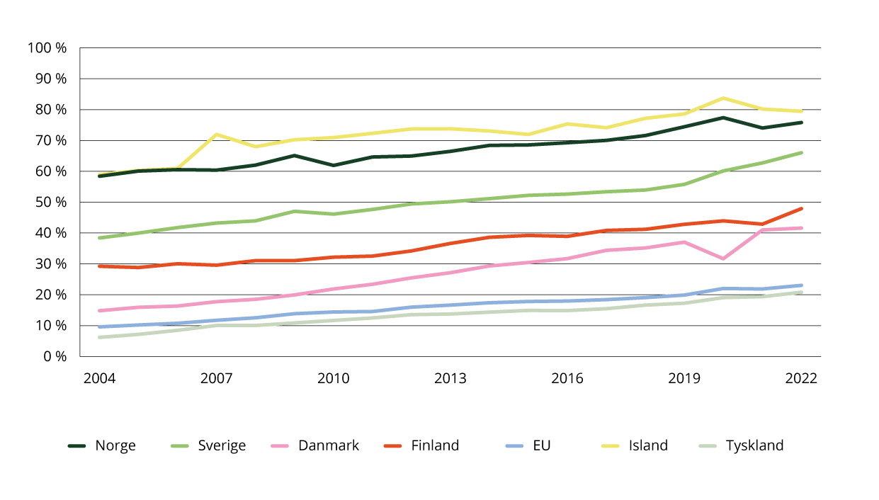 Denne indikatoren er med på å vise om økonomien omstiller seg til mindre bruk av fossile energikilder. Den internasjonale sammenligningen i figur 4.14 viser andelen fornybar energi i ulike land og inkluderer energiforbruk til transport, elektrisitet, oppvarming og nedkjøling. Nesten all energi fra elektrisitet i Norge kommer fra fornybare kilder, noe som gjør at Norge, sammen med Island, har en svært høy andel av energiforbruket sitt fra fornybar energi.