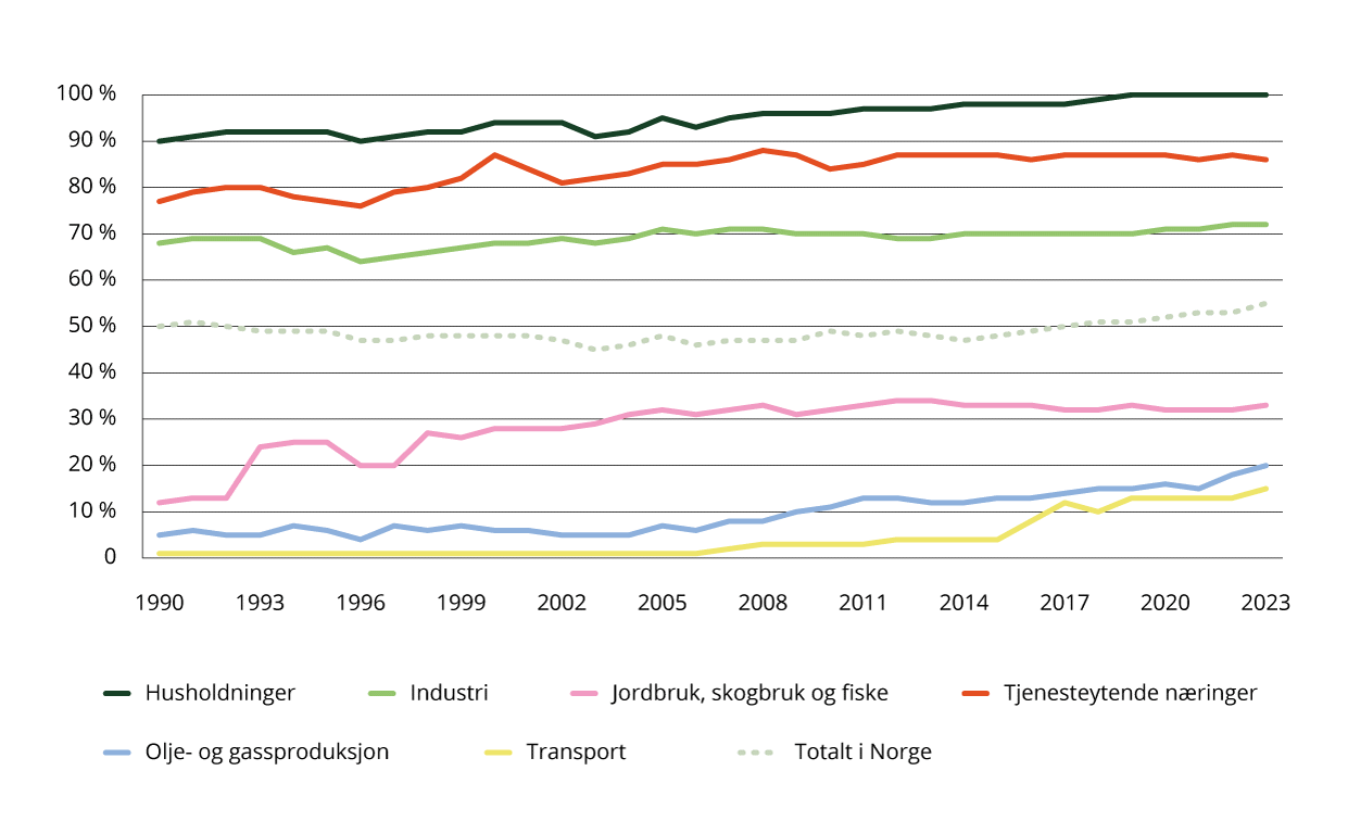 Figur 4.15 viser andelen av energiforbruket som kommer fra fornybar energi i de ulike sektorene i Norge, og det omfatter alt energiforbruk i landet.39 Av figuren ser vi at alle sektorene har hatt en økning i andelen energiforbruk som kommer fra fornybare energikilder siden 1990. Figuren viser høye fornybarandeler for husholdninger og tjenesteytende næringer. Husholdningenes strømforbruk knyttet til transport (for eksempel elbil-lading) er tatt med under husholdninger, mens forbruket deres av diesel og bensin er tatt med under transport. Dette medfører at energiforbruket i husholdningene reelt sett er høyere, og at fornybarandelen i husholdningene reelt sett er lavere enn det som fremgår av figuren. For transportnæringen er det motsatt; energiforbruket i transportnæringen er reelt satt lavere og fornybarandelen for transportnæringen er høyere enn det som fremgår av figuren. For transportnæringen og olje- og gassproduksjonen er andelen relativt sett lav, selv om de har en positiv utvikling. Dette kommer av at store deler av transportnæringen bruker fossilt drivstoff, og at det blir brukt fossile kilder til energiforbruket under olje- og gassproduksjon. Transport foregår i alle næringer, og transportnæringen i denne indikatoren inkluderer transport i alle næringer. Eksempelvis er det høyt energibruk til transport av olje- og gassprodukter, og transport er viktig i mange former for tjenesteproduksjon.