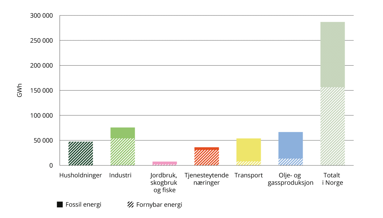 Siden alt energiforbruk i Norge er inkludert i denne figuren, har Norge samlet sett en lavere andel energiforbruk fra fornybar energi enn i den internasjonale sammenligningen i figur 4.14, som bare tar for seg transport, elektrisitet, oppvarming og avkjøling. Det er store forskjeller på mengden energiforbruk i de ulike sektorene, og en oversikt over det totale forbruket i de ulike sektorene er vist i figur 4.16.