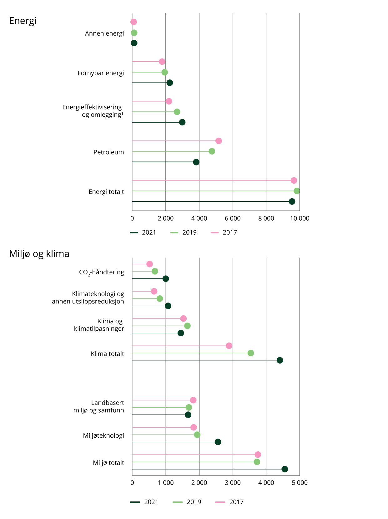 I 2021 investerte Norge nesten 82 milliarder kroner i FoU. Av disse pengene gikk over 11 milliarder kroner til FoU på energifeltet, mens 5,5 milliarder kroner gikk til miljørettet FoU og nærmere 5 milliarder kroner til FoU på klimaområdet.40 Se figur 4.17. Figuren viser FoU-investeringene, justert for inflasjon, på disse områdene med underområder. FoU-utgiftene i Norge økte også i 2022, til 89 milliarder kroner, men detaljene for den tematiske innretningen kommer kun annet hvert år. Figuren viser derfor kun tall for 2017, 2019 og 2021. Forskningsbasert kunnskap for å redusere utslippene fra energisektoren er særlig viktig for omstillingen. Innenfor energi har forskningen på energieffektivisering og på fornybar energi tiltatt over tid. FoU i kategorien petroleum, som her er knyttet til utvinning, prosessering og transport av olje og gass, har gått ned. FoU rettet mot både miljø og klima økte spesielt i 2021, særlig innenfor CO2-håndtering og klimateknologi. Dette viser at forskningsaktiviteten i sektorer som tradisjonelt er knyttet til høye utslipp, i større grad enn tidligere retter seg mot å redusere utslipp og energibruk. En analyse utført av Norges forskningsråd viser at 14 prosent av den offentlig finansierte forskningen på petroleum er målrettet mot lavere utslipp av klimagasser, og at om lag 54 prosent av prosjektene fører til bedre energieffektivitet.