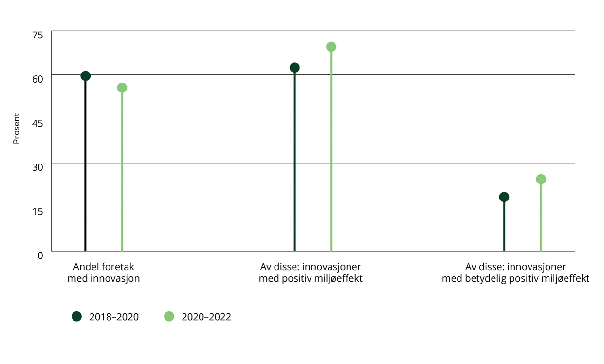 Nye eller bedre produkter og forretningsprosesser (innovasjoner) er avgjørende for at næringslivet skal bidra til grønn omstilling. Innovasjonsundersøkelsen til Statistisk sentralbyrå viser at i underkant av 60 prosent av foretakene i Norge har innovasjoner.41 Disse innovasjonene kan i større eller mindre grad gi miljø- og klimavennlige løsninger. Figur 4.18 viser andelen norske foretak som oppgir å ha innovasjoner, og andelen av disse som har innovasjoner med en positiv eller betydelig positiv miljøeffekt i de to siste undersøkelsene. Andelen av de innovative foretakene som har grønne innovasjoner, har økt i 2020–2022, selv om dette var en periode preget av pandemirestriksjoner, høye strømpriser og økonomisk usikkerhet. De viktigste motivasjonene for slike grønne innovasjoner er knyttet til omdømme og etterspørsel, men foretakene oppgir også at krav i offentlige innkjøp, bransjestandarder og miljølovgivning og andre reguleringer får stadig mer å si for at de skal innføre innovasjoner med miljøfordeler.