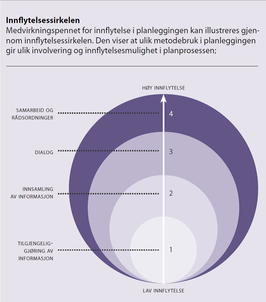 Spennet av medvirkningsmetoder i planleggingen kan fremstilles ved bruk av «innflytelsessirkler» etter ønsket omfang av involvering og engasjement fra befolkningen. Sirkelen er inspirert av Sherry Arnsteins (1969) forsøk på å forstå medvirkning i planlegging ved bruk av «medvirkningsstigen».