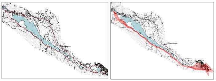 Figur 3.4 På figuren til venstre er to hovedalternativer for fremføring av vegtrase som ble drøftet i planprogramprosessen vist. Figuren til høyre viser valg av hovedtrase som det skal utarbeides reguleringsplan for. Dette er fastsatt i planprogrammet og angir ytre avgrensing av reguleringsplanområdet.