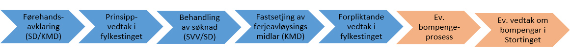 4.1 Fylkeskommunen skal avklare om vegprosjektet kjem inn under ordninga før den utformar den endelege søknaden om ferjeavløysingsmidlar. Førespurnad om ei slik førehandsavklaring skal rettast til Samferdselsdepartementet.