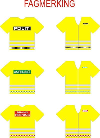 Refleksvesten skal ha gul bunnfarge, kort arm og tilfredsstille de krav som settes til fareklasse 2 i standarden NS-EN 471. I tillegg til ordinære grå refleksbånd skal den også utstyres med den enkelte etats ruterefleks. Antall striper med ruterefleks og plassering indikerer om det er en leder, en mellomleder eller et menig mannskap. Fargetegning av de respektive modeller følger vedlagt. Når det gjelder tegningen for mellomledere så er funksjonsmerkingen satt på som et eksempel.