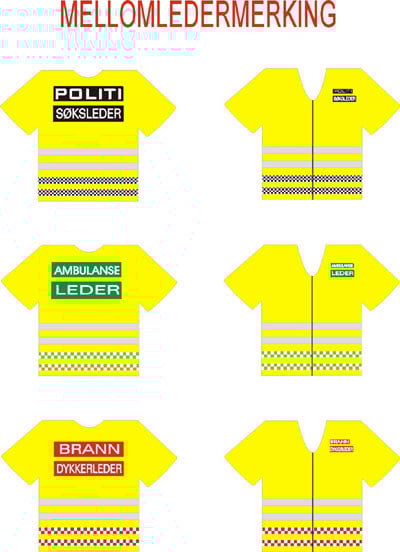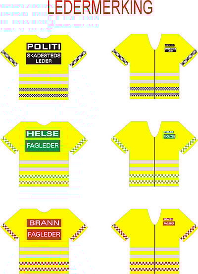 Når det gjelder fagmerking så skal alle vestene være merket med henholdsvis POLITI, HELSE eller BRANN. Ledervestene skal for politi også merkes med skadestedsleder, mens det for helse og brann skal merkes med fagleder. Merking av vestene på mellomledernivå må utformes og tilpasses av den enkelte etat. Her må man blant annet se hen på både funksjon/oppgaver og lokale forhold. Vester for menig mannskap skal kun ha etatsmerking.