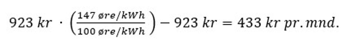 Om prisen siste kvartal i gjennomsnitt var på 147 øre/kWh (jfr. SSB, 3. kvartal 2021) vil dette, alt annet likt, utgjøre en økning i strømutgiftene på kr 433 per måned som skissert nedenfor: