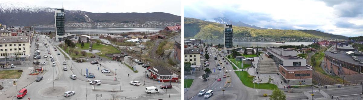 Figur 4.30 Narvik torg i 2013 (til venstre) og i 2019 (til høyre) med lekeplass og grøntanlegg, bibliotek, kafé, turistkontor, museum, sparebank, tingrett mm..