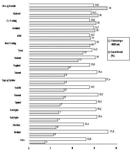 Det er store fylkesvise variasjoner i andelen garantipasienter som har ventet mer enn 6 måneder. Pr. 30.09.95 hadde sykehusene i Møre og Romsdal den største andelen garantibrudd (18%), mens Oslo lå lavest (4%). Figur 3.4 viser denne fylkesvise variasjonen i garantibrudd sammen med den fylkesvise fordelingen av befolkningens sykehusforbruk.