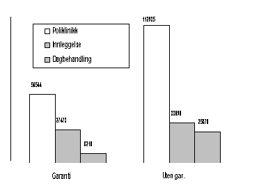 Selv om antallet garantibrudd (andel garantipasienter som har ventet mer enn seks måneder) har økt fra ca. 5.000 (6,5%) i 1993 til ca. 10.000 (10%) i 1995, har de fleste garantipasientene blitt behandlet i rett tid. En gjennomgang av andelen garantibrudd pr. fagområde, viser at ortopedisk kirurgi alene dekker en fjerdedel av alle bruddene. Andre problemområder er øre-nese-hals, urologi, øyesykdommer og karkirurgi. Figur 3.2 viser utviklingen i ventelister og garantibrudd og figur 3.3 utviklingen i antall garantibrudd pr. behandlingsnivå. Følgende konklusjoner kan trekkes ut av tabellene: