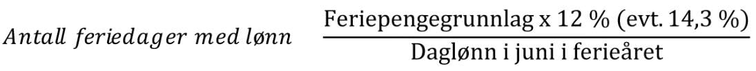 En arbeidstaker tiltrådte stilling i staten 1. mai i opptjeningsåret. I ferieåret kan arbeidstakeren ta ut 30 virkedager ferie inklusive avtalefestet ferie (25 arbeidsdager for arbeidstakere med 5 dagers arbeidsuke). Hvor mange feriedager med lønn denne arbeidstakeren skal få, beregnes med utgangspunkt i hvor mye arbeidstakeren har krav på i feriepenger. Feriepengene utgjør 12 prosent av feriepengegrunnlaget (14,3 prosent for arbeidstakere over 60 år), se ferieloven § 10 nr. 1. Deretter må feriepengene deles på arbeidstakerens daglønn i juni i ferieåret. Se nærmere om beregning av daglønn i «Beregning av lønn og trekk for kortvarige permisjoner» . Beregningen blir da slik: