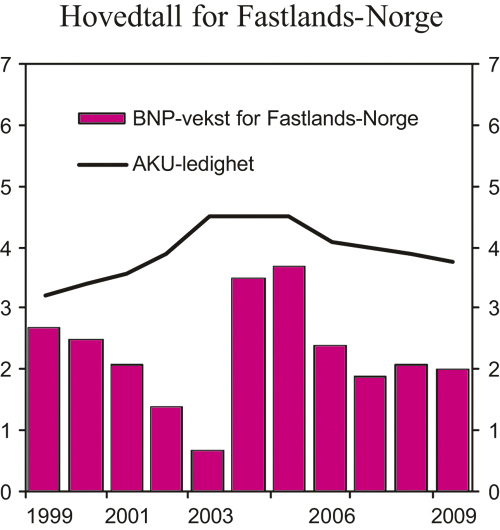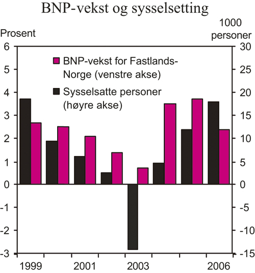 Veksten i fastlandsøkonomien er sterk. Lave renter og lav prisvekst har sammen med oppgang i boligprisene bidratt til at husholdningenes etterspørsel har vært den viktigste drivkraften bak oppgangen i norsk økonomi etter konjunkturomslaget i 2003. Gradvis har oppgangen blitt bredere basert. Lønnsomheten i næringslivet er bedret, og fastlandsinvesteringene øker. I tillegg har en sterk økning i oljeinvesteringene og solid vekst internasjonalt gitt vekstimpulser mot fastlandsøkonomien. Arbeidsmarkedet er i bedring. Sysselsettingen, målt i antall personer, har imidlertid tatt seg langsommere opp enn den sterke veksten i fastlandsøkonomien isolert sett skulle tilsi.