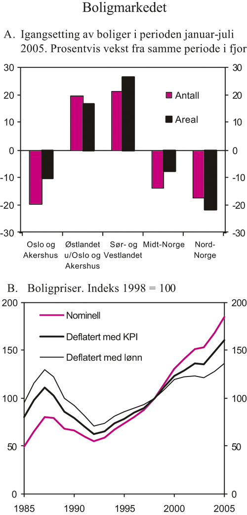 Husholdningenes etterspørsel ventes også neste år å være en viktig drivkraft i fastlandsøkonomien, men høyere renter og avtakende realinntektsvekst vil bidra til å dempe veksten sammenliknet med inneværende år. Det anslås en vekst i privat konsum på 3¾ pst. i år og 3¼ pst. neste år, mens boliginvesteringene ventes å øke med 13½ pst. i år og 1 pst. i 2006. Den videre utviklingen i husholdningenes etterspørsel er imidlertid usikker. Det lave rentenivået kan bidra til at veksten blir sterkere enn lagt til grunn. På den annen side kan den sterke gjeldsoppbyggingen de siste årene bli avløst av en konsolideringsperiode med økt sparing når rentene etter hvert øker fra dagens lave nivå.