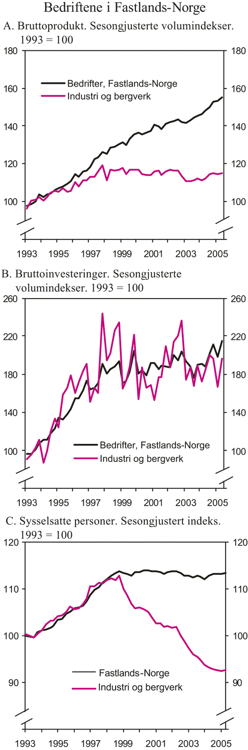 Investeringene i fastlandsbedriftene ligger nå på et høyt nivå. God lønnsomhet og økende kapasitetsutnytting trekker i retning av fortsatt vekst både i år og neste år. Statistisk sentralbyrås investeringstelling peker også mot sterk vekst i industriinvesteringene i begge årene. Samlet sett ventes investeringene i fastlandsbedriftene å øke med 4½ pst. i år og 6 pst. neste år.