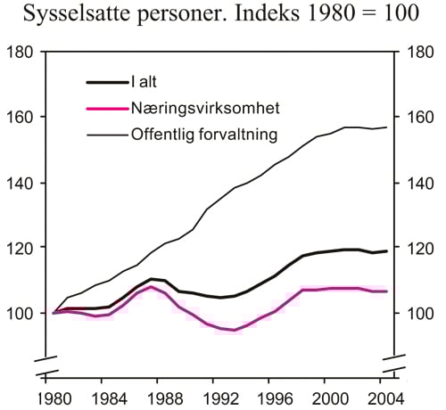 Det er flere grunner til dette. Sykefraværet har falt og redusert behovet for nyansettelser. Nedgangen i sykefraværet gjennom 2004 svarer til 40 000 årsverk. Det har i hovedsak vært privat sektor som har bidratt til sysselsettingsveksten i inneværende konjunkturoppgang, mens oppgangen i offentlig sysselsetting har vært moderat. Dette kan belyses med at offentlig sektor stod for om lag halvparten av samlet sysselsettingsvekst i de første to årene av de to foregående konjunkturoppgangene. I den inneværende oppgangskonjunkturen har privat sektor stått for nesten to tredeler av sysselsettingsveksten.