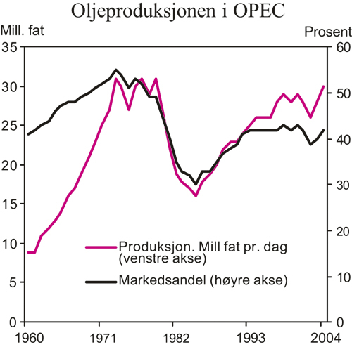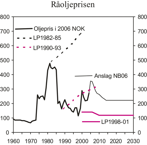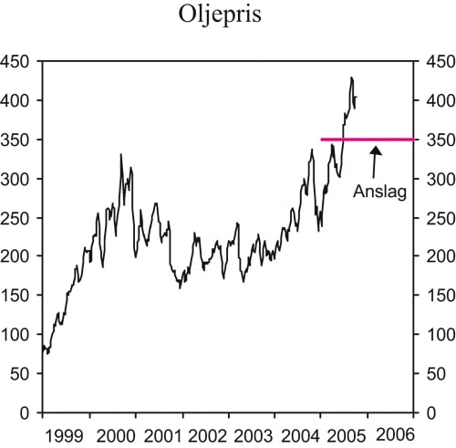 Oljeprisen har økt med om lag 140 kroner pr. fat siden årsskiftet, til over 400 kroner pr. fat ved utgangen av september. I denne meldingen legges det til grunn en gjennomsnittlig oljepris på 350 kroner pr. fat i både 2005 og 2006. Realprisen på råolje har ikke vært høyere siden første halvdel av 1980-tallet.