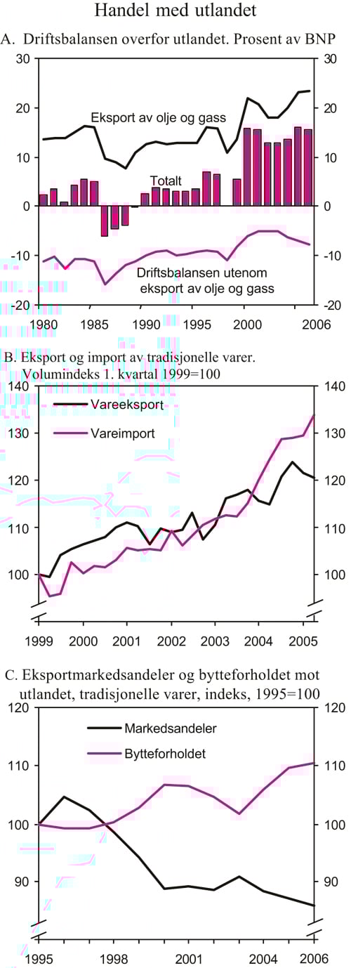Eksporten av tradisjonelle varer anslås å øke med 3½ pst. i år og 4¼ pst. neste år. Dette er lavere enn anslaget for markedsvekst hos våre viktigste handelspartnere, slik at norske eksportørers markedsandeler fortsetter å falle. Nedgangen i markedsandeler må bl.a. ses i sammenheng med det høye norske kostnadsnivået.