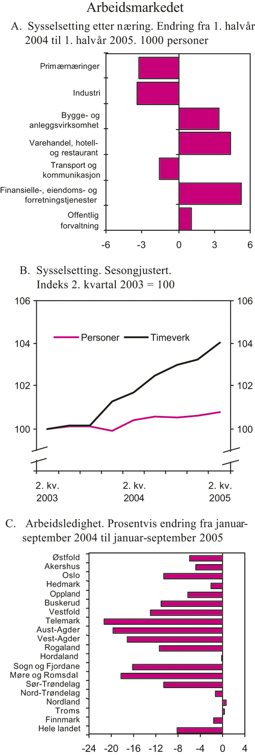 Situasjonen i arbeidsmarkedet er i bedring. Utviklingen i sysselsettingen, målt ved antall personer, har imidlertid vært noe svakere enn veksten i fastlandsøkonomien isolert sett skulle tilsi. Dette må bl.a. ses på bakgrunn av at nedgangen i sykefraværet og overgang fra deltids- til heltidssysselsetting har redusert behovet for nyansettelser. I tillegg undervurderes trolig veksten i sysselsettingen i statistikken, fordi økt arbeidsinnvandring fra de nye EU-landene ikke fullt ut fanges opp. Den høye aktiviteten i norsk økonomi ventes å bidra til sterkere vekst i personsysselsettingen framover. Det anslås en økning på 0,5 pst. fra 2004 til 2005, svarende til 12 000 personer, og en ytterligere økning på 0,8 pst. i 2006, svarende til 18 000 personer.