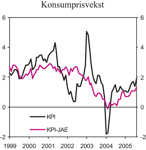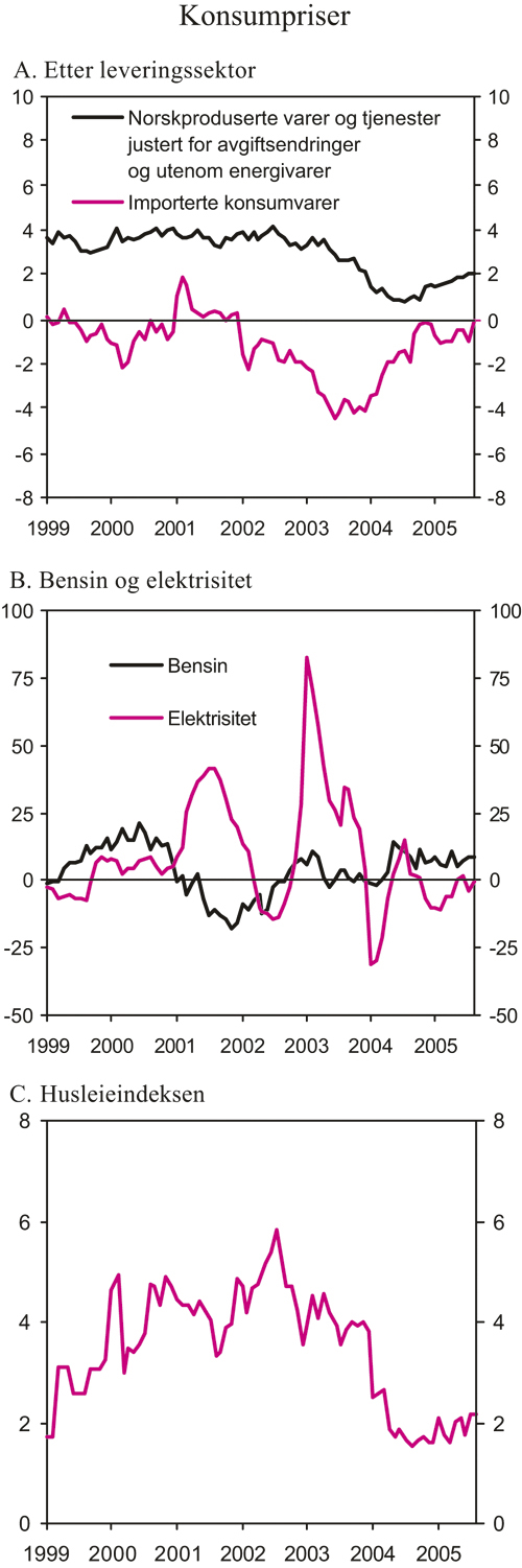 Konsumprisveksten (KPI) har tatt seg noe opp det siste året, særlig som følge av økte priser på transporttjenester og vekst i husleiene. Høyere bensinpriser og noe mindre nedgang i prisene på importerte konsumvarer trekker også KPI opp. Konsumprisene var i august 1,9 pst. høyere enn ett år tidligere. Justert for avgiftsendringer og uten energivarer (KPI-JAE) økte prisene med 1,3 pst. fra august 2004 til august i år. Moderat lønnsvekst og styrkingen av kronen gjennom det siste året ventes å bidra til at konsumprisveksten blir relativt lav både i år og neste år. Det ventes likevel at prisveksten på norskproduserte varer og tjenester vil ta seg noe opp framover.