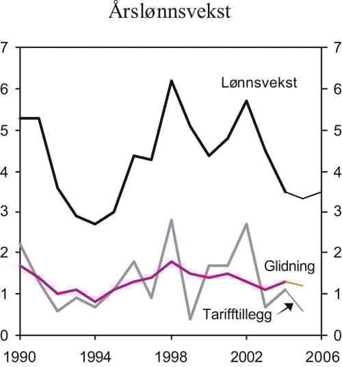 Årslønnsveksten avtok til 3,5 pst. i 2004 etter en vekst på 4,5 pst. året før. Selv om veksten i aktiviteten i fastlandsøkonomien nå er sterk, preges deler av næringslivet av at den kostnadsmessige konkurranseevnen fortsatt er betydelig svakere enn i annen halvdel av 1990-tallet. Dette, sammen med lav prisvekst og økt tilbud av arbeidskraft fra de nye EU-landene, kan ha bidratt til at årets lønnsoppgjør ble gjennomført med moderate sentrale tillegg. Årslønnsveksten ventes å bli 3¼ pst. i år og 3½ pst. neste år. Innføringen av obligatorisk tjenestepensjon innebærer at de samlede lønnskostnadene vil vokse sterkere, anslagsvis med 3¾ pst. Til sammenlikning anslås lønnskostnadsveksten hos våre handelspartnere til om lag 3 pst. både i år og neste år.