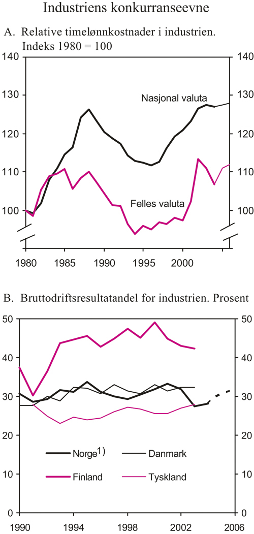 Veksten i eksportvolumet av tradisjonelle varer har vært noe svakere enn i tidligere oppgangskonjunkturer. Det må trolig ses i lys av at den kostnadsmessige konkurranseevnen er svekket, etter flere år med høy kostnadsvekst. Samtidig har veksten i euroområdet vært relativt lav. Prisene på viktige norske eksportvarer har imidlertid hatt en gunstig utvikling så langt i denne konjunktursyklen og dermed bidratt til at lønnsomhetsutviklingen og investeringsveksten i industrien har vært sterk.