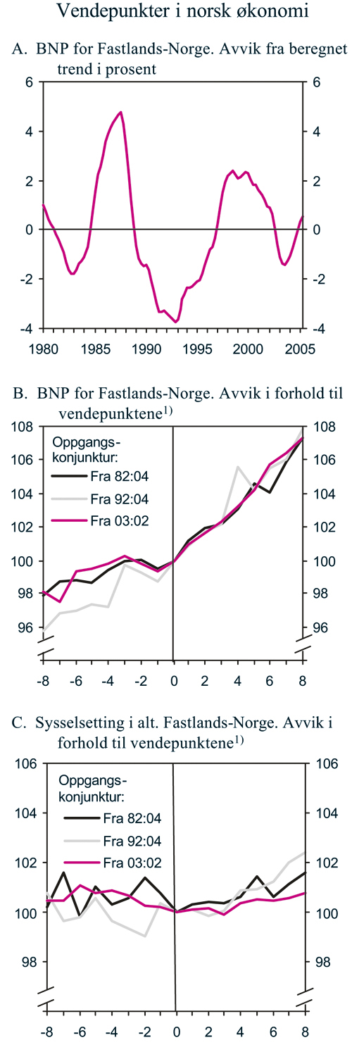 For å tallfeste omslagene i konjunkturene er faktisk BNP for Fastlands-Norge sammenliknet med en trendrenset serie. Bunnpunktene i konjunktursykelen defineres som det kvartalet da forskjellen mellom disse to seriene er størst, jf. figur 2.24A. Når bunnpunktene er beregnet med utgangspunkt i kvartalstall kan utslagene i avvik fra beregnet trend være noe større enn ved bruk av årstall. Med denne metoden kan de siste tre konjunkturoppgangene anslås å ha startet i hhv. 4. kvartal 1982, 4. kvartal 1992 og 2. kvartal 2003. Som det framgår av figur 2.24, var nedgangskonjunkturene forut for de to foregående konjunkturoppgangene kraftigere enn den nedgangen norsk økonomi var gjennom ved årtusenskiftet.
