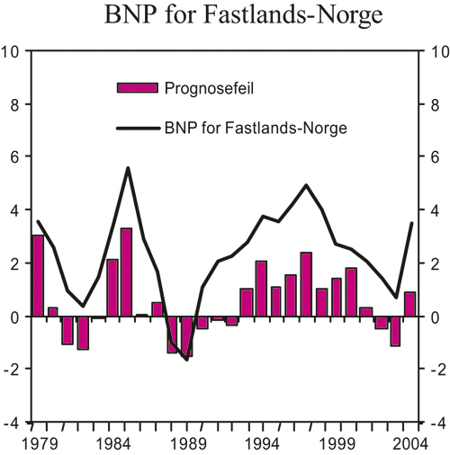 I ettertid kan treffsikkerheten i de makroøkonomiske prognosene belyses ved å sammenlikne anslagene med den faktiske utviklingen ifølge nasjonalregnskapet. I figur 2.25 er dette gjort for Finansdepartmentets anslag for veksten i BNP for Fastlands-Norge. Det synes å være en klar tendens til at anslagene undervurderer konjunktursvingningene, og prognosefeilene har gjennomgående vært større i oppgangskonjunkturer enn i nedgangskonjunkturer.