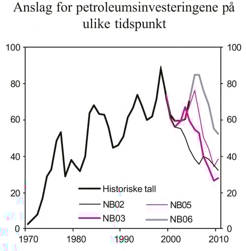 Oljeinvesteringene ventes å øke med 20 pst. i inneværende år etter en vekst på vel 12 pst. i fjor. Oljeinvesteringene anslås nå å holde seg uendret fra 2005 til 2006, mens det i Revidert nasjonalbudsjett ble anslått en nedgang på 10 pst. Oljeselskapenes investeringsplaner innebærer at oljeinvesteringene skal avta i årene etter 2006. Den høye oljeprisen kan bl.a. bidra til å forskyve en ventet nedgang i oljeinvesteringene. Det vil isolert sett gi positive impulser mot fastlandsøkonomien, særlig til verkstedsindustrien og annen oljerelatert virksomhet.