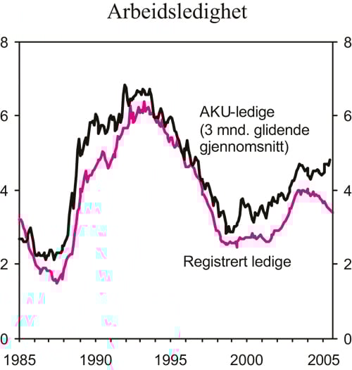 Tall fra Aetat viser at summen av registrerte ledige og personer på ordinære arbeidsmarkedstiltak er redusert med nesten 13 000 personer det siste året. På den annen side viser tall fra Statistisk sentralbyrås arbeidskraftundersøkelse (AKU) en økning i antall arbeidssøkere uten arbeidsinntekt på 9000 personer. Aetats statistikk er bedre i overensstemmelse med andre indikatorer for utviklingen i norsk økonomi, og gir trolig et bedre bilde av utviklingen i arbeidsledigheten den siste tiden. AKU er en utvalgsundersøkelse, og er dermed beheftet med usikkerhet. Dette illustreres av betydelige svingninger i AKU-ledigheten, som også i tidligere periodevis har vist en annen utvikling enn den registrerte ledigheten, jf. figur 2.3. I tillegg ser det ut til at AKU det siste året, i større grad enn tidligere, fanger opp personer på attføring som arbeidssøkere.