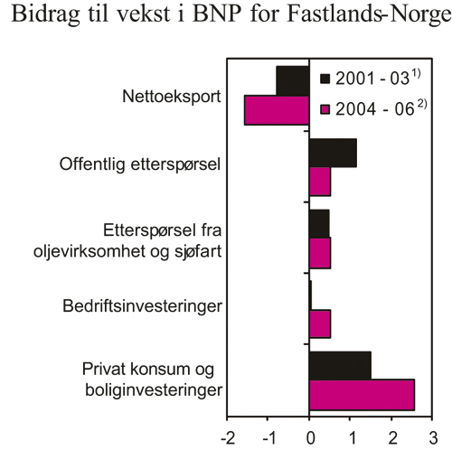 Etter tre år med relativt svak vekst, gikk norsk økonomi inn i en konjunkturoppgang våren 2003. Selv om den forutgående nedgangskonjunkturen var svakere enn nedgangskonjunkturene på 1980- og 1990-tallet, har aktivitetsveksten i fastlandsøkonomien så langt vært om lag like sterk som i de to foregående oppgangskonjunkturene. I begge de to foregående konjunkturoppgangene var sterk vekst i internasjonal økonomi en viktig drivkraft i de første årene av oppgangen. På 1980-tallet bidro også kraftige impulser fra oljeinvesteringene til å trekke veksten opp. I inneværende konjunkturoppgang er det særlig veksten i husholdningenes etterspørsel, og etter hvert også bedriftsinvesteringene, som har bidratt til sterk vekst i BNP. Også investeringene i oljevirksomheten har vokst kraftig i denne oppgangen, men bidraget til veksten i BNP var langt sterkere på 1980-tallet. Bidragene fra offentlig konsum og offentlige investeringer har vært mindre i denne konjunkturoppgangen enn på 1980- og 1990-tallet.