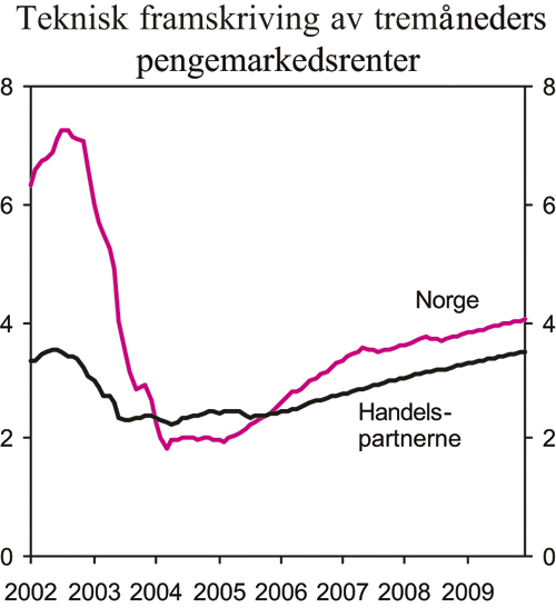 Den norske tremåneders pengemarkedsrenten er nå om lag lik gjennomsnittet hos våre viktigste handelspartnere. Terminrentene øker imidlertid noe raskere i Norge enn hos handelspartnerne, slik at rentedifferansen forventes å stige til om lag ½ prosentpoeng ved utgangen av neste år.