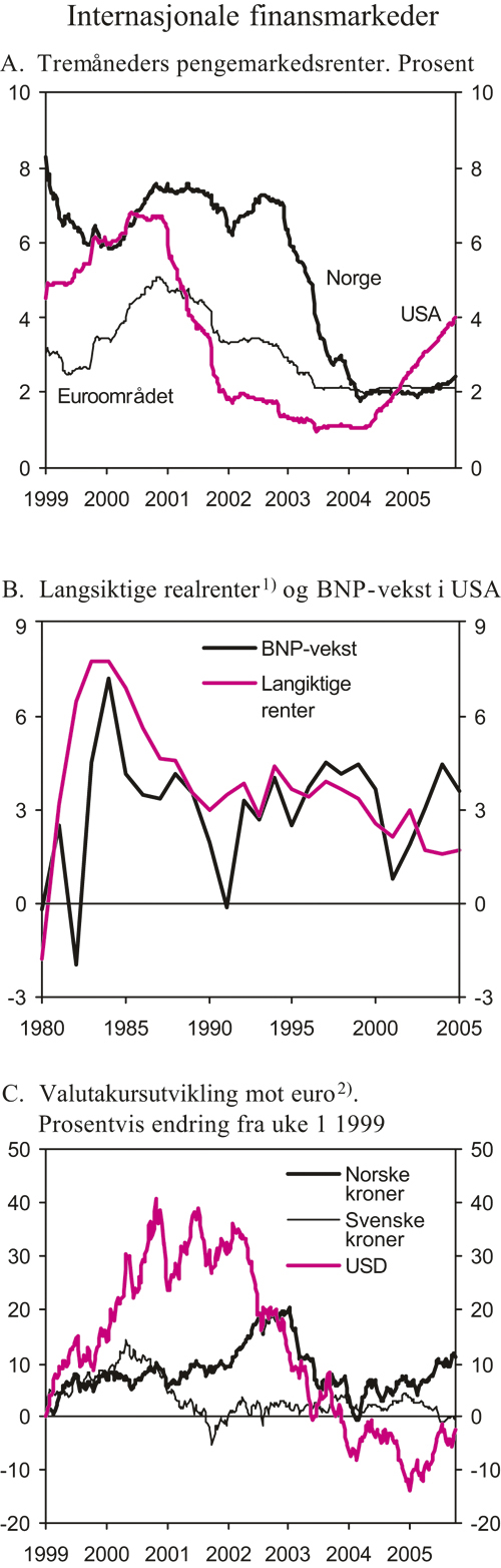 De implisitte terminrentene har falt noe siden framleggelsen av Revidert nasjonalbudsjett 2005. De viser nå et forløp der den tremåneders pengemarkedsrenten stiger med om lag ¼ prosentpoeng innen utgangen av året. Gjennom 2006 ventes pengemarkedsrenten å øke med ¾ prosentpoeng til om lag 3¼ pst. mot slutten av året. Renten ventes å stige ytterligere utover i framskrivingsperioden.
