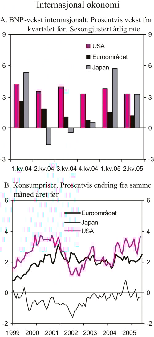 Veksten i verdensøkonomien i 2004 var den sterkeste på tre tiår. Sammen med en naturlig konjunkturavmatning ventes høye oljepriser å trekke BNP-veksten i verden ned fra 5 pst. i 2004 til 4¼ pst. i 2005 og 2006. Den relativt beskjedne avmatningen må ses i sammenheng med at lave renter fortsatt bidrar til å holde etterspørselen oppe. Veksttakten i år varierer betydelig mellom regionene, fra 7–8 pst. i de framvoksende økonomiene i Asia, inkludert Kina og India, til 1¼ pst. i euroområdet. Blant industrilandene ventes det fortsatt sterk utvikling i USA.