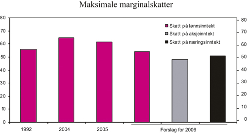 Med Regjeringens forslag til reduksjon i toppskatt og fjerning av den ekstra arbeidsgiveravgiften på lønnsinntekt over 16 G, vil marginalskatten på lønn (inklusiv arbeidsgiveravgift) reduseres til 49,9 pst. i trinn 1 og 54,3 pst. i trinn 2 i toppskatten. For de fleste skattytere vil det dermed på marginen ha liten betydning om avkastningen tas ut som utbytte, som får en marginalskatt på omlag 48,2 pst., eller som lønn. Til sammenlikning var høyeste marginalskatt på lønn (inklusiv arbeidsgiveravgift) 56,1 pst. etter gjennomføringen av skattereformen i 1992, jf. figur 4.1.
