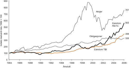 Figur 1.1 viser utviklingen i akkumulert realavkastning av aksjer, obligasjoner og fast eiendom i USA i perioden 1984 – 2006. Aktivaklassen fast eiendom er representert ved to indekser som gir et noe forskjellig bilde. Den første er den tidligere omtalte TBI-indeksen som er transaksjonsbasert og måler akkumulert avkastning av unoterte investeringer uten belåning. TBI-indeksen viser en akkumulert avkastning i 2006 som ligger marginalt høyere enn den for obligasjoner og vesentlig lavere enn for aksjer. Den andre indeksen gjelder eiendomstruster (REITs) og viser en akkumulert avkastning som er klart høyere enn TBI-indeksen. Figur 1.1 viser dessuten at aksjer har gitt vesentlig høyere avkastning enn noen av de andre aktivaklassene, til tross for korreksjonene i årene etter 2000. Tilsvarende data fra Storbritannia og Australia viser at avkastningen av fast eiendom ligger nærmere den for aksjer enn i USA.