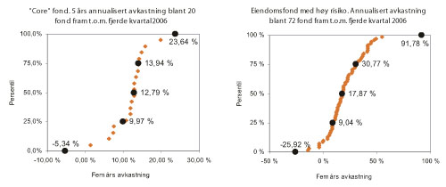 Kilde: Townsend, 2007. Tallene i figuren viser avkastningen i hvert kvartil. For eksempel hadde de 25 prosent dårligste fondene med høy risiko en avkastning på 9,04 prosent eller lavere, mens de 25 prosent beste fondene hadde en avkastning på 30,77 prosent eller høyere.