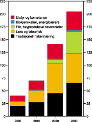 På fiskeri og havbrukssektoren tyder ulike anslag på at verdien av Norges eksport vil kunne øke fra NOK 30 milliarder til mellom 100 og 150 milliarder i løpet av de neste 20 årene. Allerede i dag står havbruksnæringen for større eksportverdi enn villfanget fisk. Den vil dermed på en avgjørende måte kunne bidra til å kompensere for en framtidig nedbygging av oljeaktiviteten på norsk sokkel og gi sterke impulser til vekst og sysselsetting i Norges kystdistrikter.