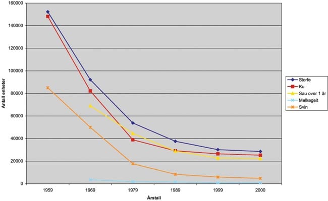 Selv om antallet gårdsbruk med husdyr ble redusert med 70–80 % fra 1969 til 1999 økte samtidig det totale antallet husdyr i landbruket. Både antallet svin og sau økte, mens antallet verpehøner og storfe holdt seg ganske stabilt. Slaktefjørfe kom inn som en ny og industripreget husdyrproduksjon. Konsesjonsbestemmelsene satte likevel tak for besetningsstørrelsene. Selv om det dukket opp enkelte store slaktegrisbesetninger og hønserier, ble ikke utviklingen av «monokulturer» innen husdyrholdet like tydelig i Norge som i det øvrige Europa.