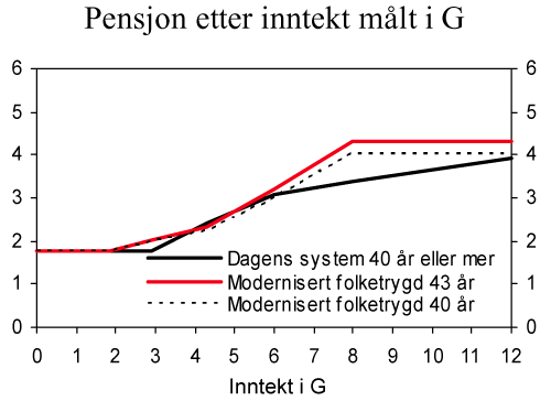 Figuren viser at med 43 års opptjening vil de med inntekt mellom 4 G (235 100 kroner) og 4,95 G (291 000 kroner) komme noe dårligere ut med opptjeningsreglene i modernisert folketrygd enn med dagens folketrygd. Det samme gjelder personer med 40 års opptjening og inntekter mellom 3,7 G (217 500 kroner) og 6 G (352 700 kroner).