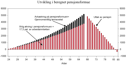 Dette gir en årlig alderspensjon på kr. X (med dagens lønnsnivå og forventet levealder) ved 67 år