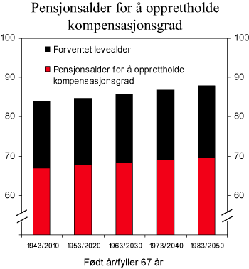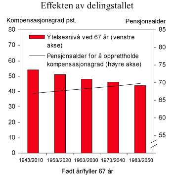 Pensjonskommisjonens forslag om å innføre et delingstall innebærer at kompensasjonsgradene over tid reduseres for en gitt pensjoneringsalder. Reduksjonen vil avhenge av hvor mye forventet levealder øker. Den enkelte kan kompensere for delingstallet ved å arbeide lenger. Det er anslått at delingstallet vil redusere alderspensjonen for nye pensjonister ved 67 år med om lag 18 pst. i 2050 i forhold til 2010 som følge av at forventet gjenstående levealder ved 67 år forventes å øke med ca. 4 år. Dette følger av middelalternativet i Statistisk sentralbyrås befolkningsframskrivninger. Kompensasjonsgraden ved 43 års opptjening reduseres dermed fra 54 pst. av gjennomsnittlig inntekt i 2010 til 44 pst. i 2050. Kompensasjonsgraden vil være lavere ved færre års opptjening, og høyere ved flere år. Figur 4.3 viser at den enkelte kan kompensere for utviklingen i delingstallet ved å jobbe lenger. Med en økning i levealderen på ett år, er det innenfor modernisert folketrygd anslått at en må jobbe 8 måneder lenger for å opprettholde samme kompensasjonsgrad. Med den anslåtte økningen i levealderen, innebærer det at den enkelte i 2050 må jobbe 2 år og 8 måneder lenger for å oppnå samme kompensasjonsnivå som en som går av med pensjon som 67-åring i 2010.