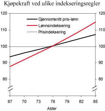 En annen måte å se dette på er at en svakere indeksering gjør det mulig å øke startnivået på pensjonene for en gitt nåverdi av de samlede utbetalingene gjennom pensjonistperioden. Dette er illustrert i figur 4.13, som viser utviklingen i kjøpekraft over tid ved de ulike indekseringsreglene, gitt samme nåverdi av de samlede pensjonsytelsene. Med en anslått reallønnsvekst på 1,5 pst., innebærer dette at kompensasjonsgraden ved 67 år blir ca. 4 prosentpoeng høyere hvis de løpende pensjonene reguleres i takt med gjennomsnittet av lønns- og prisveksten enn dersom pensjonene lønnsindekseres. En svakere indeksering innebærer lavere utgifter for en gitt kompensasjonsgrad ved overgang til pensjon.
