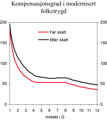 Pensjonskommisjonens forslag til modernisert folketrygd innebærer at man for gjennomsnittsinntekter viderefører et kompensasjonsnivå på om lag samme nivå som i dag. Med en inntekt på 5 G (293 900 kroner) i 43 år er kompensasjonsgraden før skatt på 54 pst. Figur 4.2 viser at kompensasjonsgraden etter skatt for gjennomsnittsinntekter er om lag 10 prosentpoeng høyere enn kompensasjonsgraden før skatt. Forskjellen er større for lavere inntektsnivåer. Forskjellene må ses i sammenheng med at pensjonsytelser skattlegges med en lavere sats enn lønnsinntekt, og at skattesystemet er progressivt.