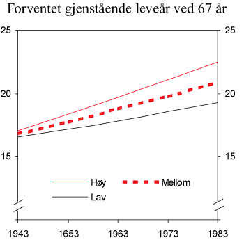Figur 4.4 viser høy-, lav- og mellomalternativet i Statistisk sentralbyrås anslag på utviklingen i forventet gjenstående levealder ved 67 år for ulike fødselsår (kohorter). I figuren framgår det at forventet levealder ved 67 år for de ulike kohortene øker i alle tre alternativene. For de som er født i 1983, er det høyeste anslaget i 2050 på 22 år, mens det laveste anslaget er på 19,3 år. Alternativet med lav forventet levealder vil innebære en svakere økning i delingstallet og dermed mindre reduksjon i kompensasjonsgraden enn det som følger av mellomalternativet, mens alternativet med høyere forventet levealder vil innebære en sterkere reduksjon.