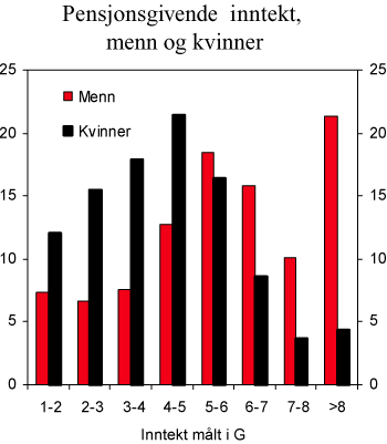 Regjeringen støtter Pensjonskommisjonens forslag om at pensjonssystemet bør inneholde tydelige fordelingselementer som innebærer overføringer fra de som har høy inntekt til de som har lav inntekt. Regjeringen vil vurdere garantipensjonens nivå og utforming nærmere, og ønsker å bedre ordningen med pensjonsopptjening ved ulønnet omsorgsarbeid. Så lenge kvinner har lavere yrkesaktivitet og lønnsnivå enn menn, vil en tettere sammenheng mellom arbeidsinntekt og pensjon i gjennomsnitt være mer fordelaktig for menn enn for kvinner. På den annen side vil de foreslåtte forbedringene av ordningen med omsorgsopptjening styrke kvinners pensjonsrettigheter vesentlig mer enn menns. Effekten av endringer i pensjonssystemet må også vurderes i lys av sannsynlige endringer i kvinners yrkesmønster framover. Et pensjonssystem med sterke arbeidsinsentiver kan stimulere kvinner til å delta og styrke sin posisjon i arbeidslivet. Regjeringen legger til grunn at arbeidet for likestilling i arbeidslivet vil bidra til at lønnsforskjeller mellom kvinner og menn utjevnes, hvilket også vil medføre at pensjonsopptjeningen blir mer lik mellom kjønnene.