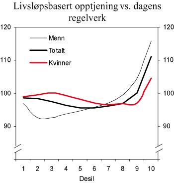 I forhold til dagens folketrygd vil personer med færre opptjeningsår komme relativt sett dårligere ut, og det samme gjelder personer med ujevn inntekt over livsløpet som følge av at besteårsregelen faller bort. Siden det ikke vil være noen øvre grense for antall opptjeningsår, vil personer med mer enn 43 års opptjening komme bedre ut enn det som framgår av figur 4.1.