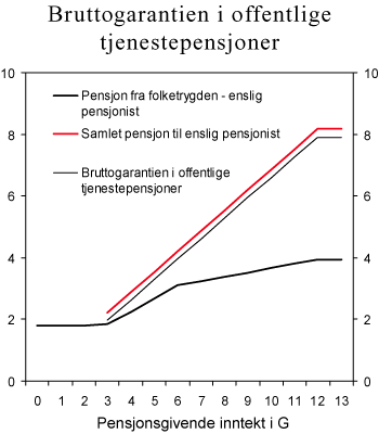 Bruttogarantien i de offentlige tjenestepensjonsordningene innebærer at eventuelle endringer i folketrygden ikke får noen betydning for det garanterte pensjonsbeløpet. Pensjonistens samlede pensjon blir dermed ikke berørt av endringer i folketrygden. Dersom ytelsene fra folketrygden reduseres, vil tjenestepensjonsordningens forpliktelser økes tilsvarende, samtidig som tjenestepensjonen reduseres ved økte ytelser fra folketrygden.